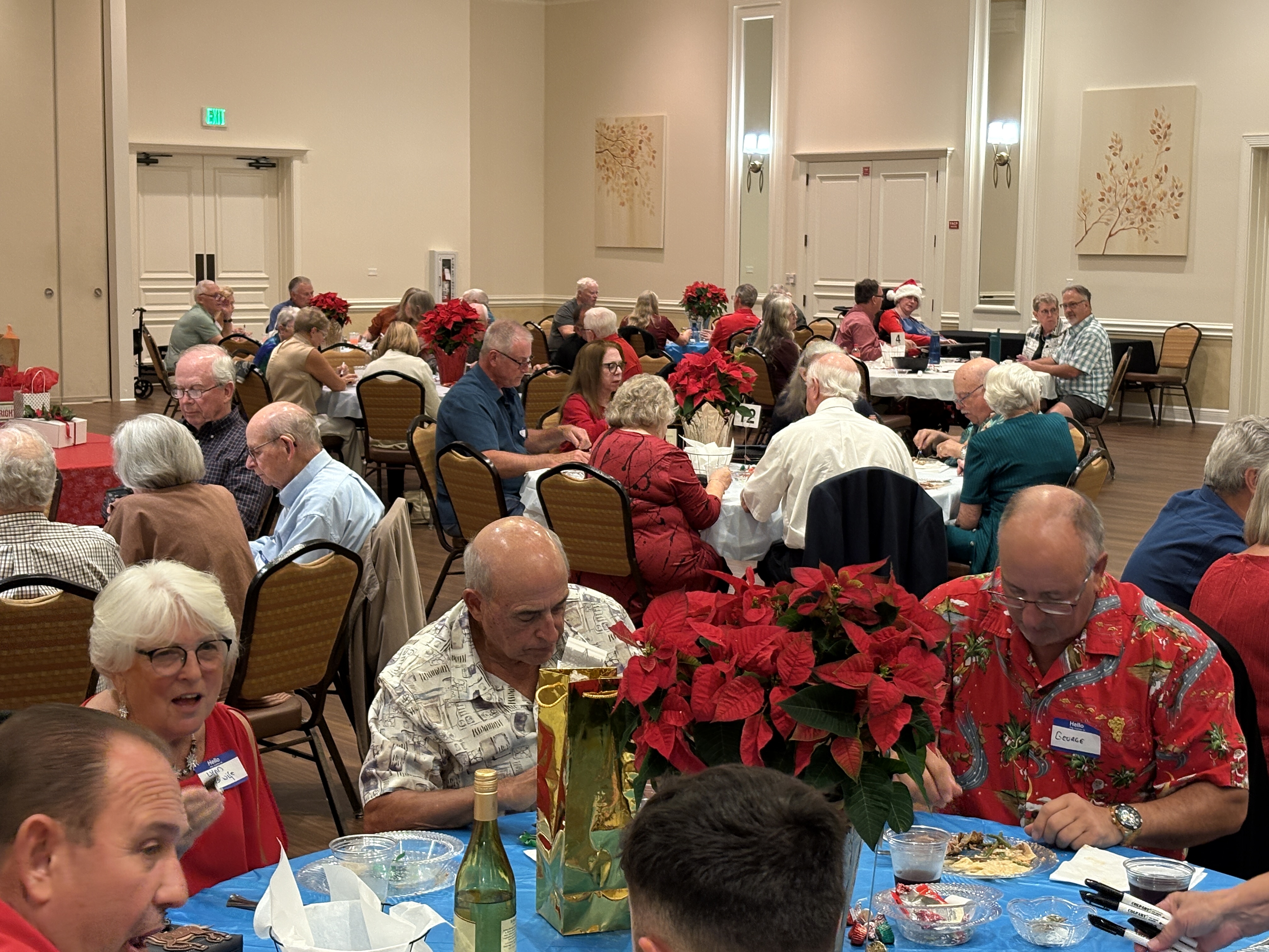 We held our 2025 Christmas Holiday Party at the Candler Lodge that included fine food, great music, gifts and prizes that kept all 110 guests laughing and dancing the whole night through. Much gratitude is extended to Ray Baker and his wife, Linda, for reserving the Lodge Ballroom then planning the dinner and music. Mike and Kathleen Betz coordinated the evening’s events between Ray Baker and Alex Fedele. Paul Garguillo and Alex Fidele set up the gifts and a raffle with a couple of twists and turns. In the back ground during the months of planning was Jack Kezelian our treasurer trusted with cost control.